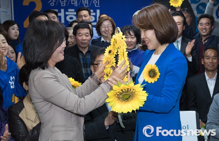 (서울=포커스뉴스) 전현희 더불어민주당 강남을 후보의 당선이 유력시된 14일 새벽 서울 강남구 로즈데일빌딩에 위치한 선거사무소에서 전 후보와 지지자들이 기뻐하고 있다.