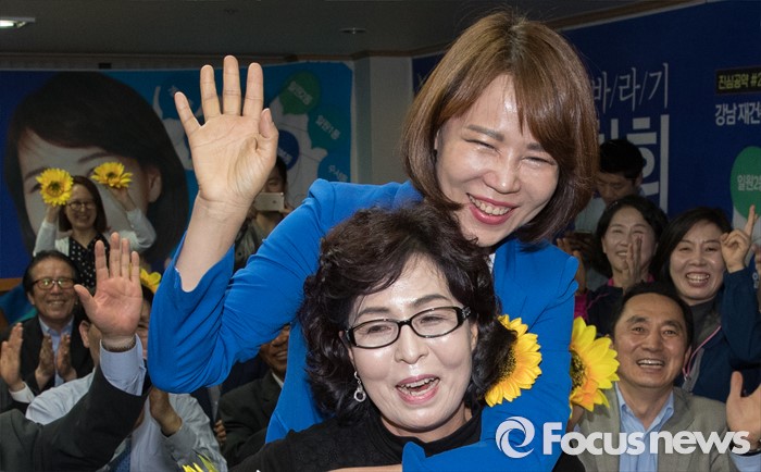 (서울=포커스뉴스) 2016 제20대 국회의원선거날인 13일 오후 서울 강남구 로즈데일빌딩에 위치한 전현희 더불어민주당 강남을 후보 선거사무소에서 전 후보가 당선이 유력해지자 지지자들과 기뻐하고 있다.