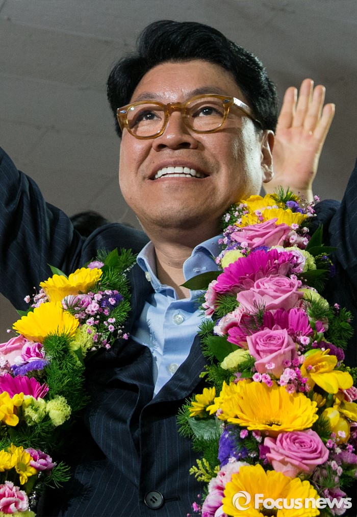 (부산=포커스뉴스) 제20대 국회의원선거에서 당선이 확실시된 장제원 무소속 부산 사상구 후보가 14일 오전 부산 사상구 선거사무소에서 밝게 웃고 있다.