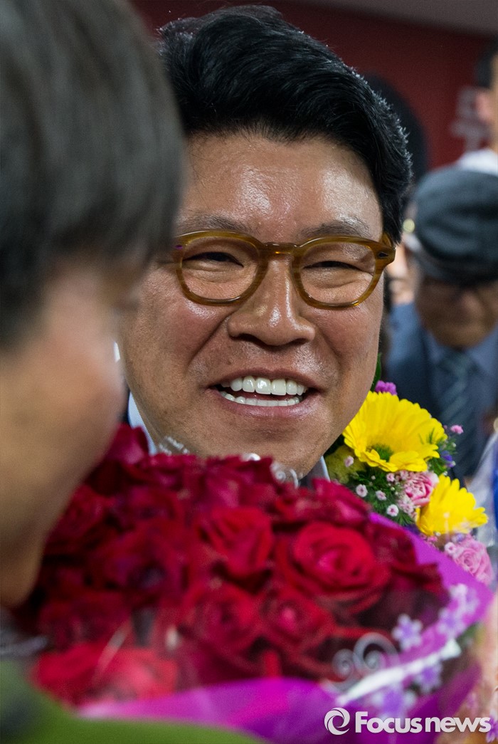 (부산=포커스뉴스) 제20대 국회의원선거에서 당선이 확실시된 장제원 무소속 부산 사상구 후보가 14일 오전 부산 사상구 선거사무소에서 밝게 웃고 있다.