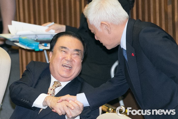 2위는 38.1%를 차지한 새누리당 강세창 후보가 차지했다.(서울=포커스뉴스) 김한길(오른쪽) 더불어민주당 의원과 문희상 의원이 31일 오전 서울 여의도 국회 본회의장에서 인사하고 있다. 2015.12.31 박철중 기자