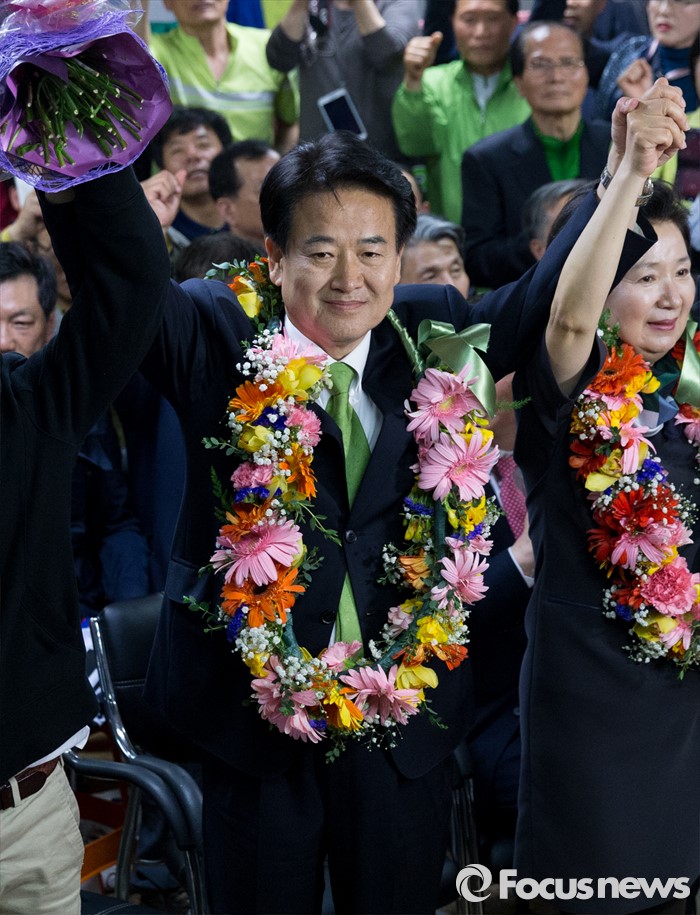 (전주=포커스뉴스) 정동영 국민의당 전주시병 당선인이 14일 오전 전북 전주시 금암동 선거사무소에서 당선이 확정되자 지지자들과 환호하고 있다.