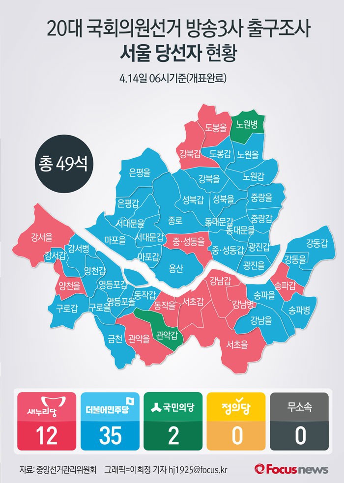 (서울=포커스뉴스) 20대 국회의원선거 개표결과 서울지역에서 새누리당은 12석, 더불어민주당이 35석, 국민의당은 2석을 차지했다.