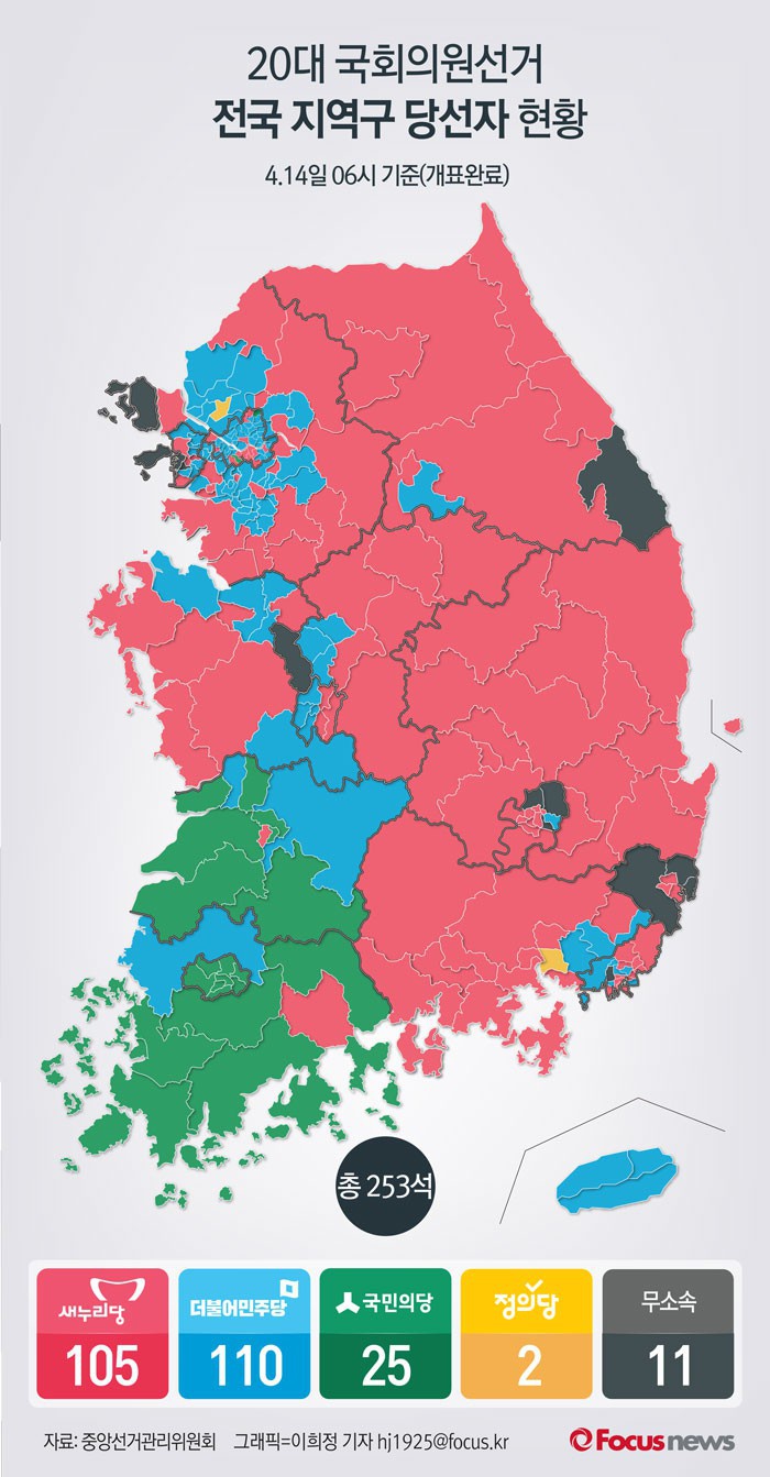 (서울=포커스뉴스) 20대 국회의원선거 개표결과 전국 지역구에서 새누리당은 105석, 더불어민주당이 110석, 국민의당 25석, 정의당 2석, 무소속은 11석을 차지했다.