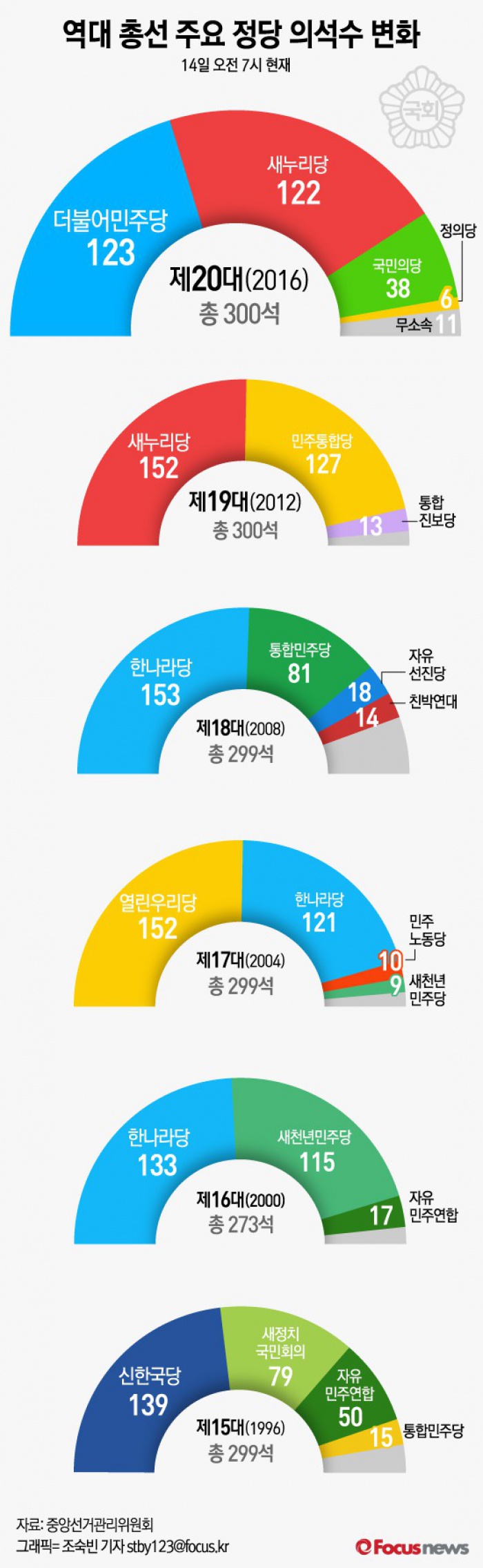 (서울=포커스뉴스) 4·13 총선 결과 새누리당이 122석, 더불어민주당은 123석, 국민의당은 38석, 정의당 6석을 얻었으며 무소속 당선자는 11석으로 결정됐다.