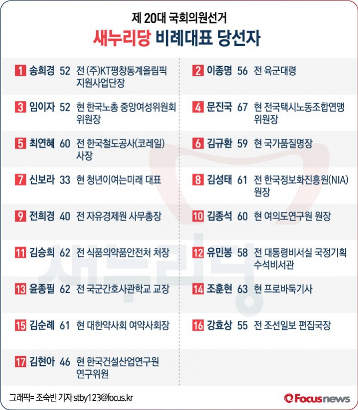 (서울=포커스뉴스) 제 20대 국회의원선거 결과, 새누리당은 총 17명의 비례대표가 국회에 입성할 수 있게 됐다.