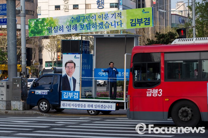 (대구=포커스뉴스) 제20대 국회의원선거 대구 수성구갑 선거구에서 당선된 더불어민주당 김부겸 당선자가 14일 오전 대구 수성구 범어네거리에서 당선 인사를 하고 있다.