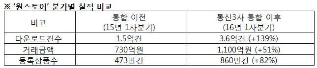 이재환 원스토어 대표는 “지난해 통신사 통합스토어를 출시한 이후 다운로드수 2.4배, 등록상품수 1.8배, 거래액 1.5배 증가 등 가시적 성과를 만들었으며, 이번 통합을 통해 사업규모가 더 커지게 된 만큼, 더 큰 고객혜택으로 보답하겠다”며 서비스에 대한 자신감을 나타냈다.원스토어의 분기별 실적.<표제공=원스토어>