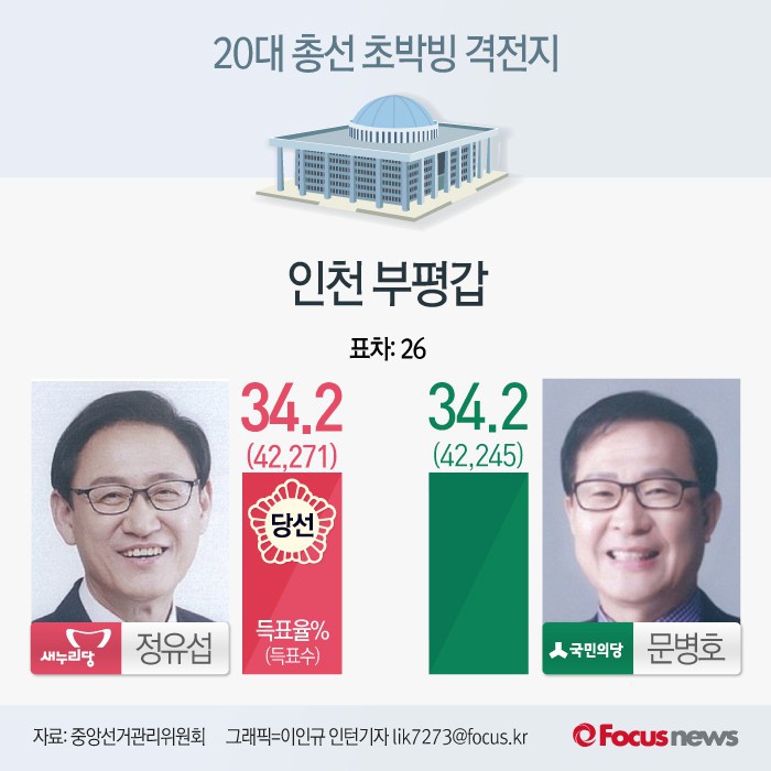 (서울=포커스뉴스) 13일 치러진 20대 국회의원선거 인천 부평갑 선거구에서 새누리당 정유섭 후보가(42,271표) 국민의당 문병호 후보를(42,245표) 26표 차이로 누르며 초박빙 승부를 펼쳤다.