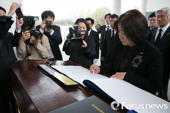 (서울=포커스뉴스) 심상정 정의당 상임대표가 14일 오전 동작구 국립서울현충원에서 현충탑 참배를 마친 뒤 방명록을 작성하고 있다.