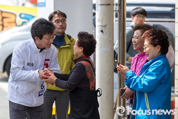 (대구=포커스뉴스) 제20대 국회의원선거 대구 동구을 지역구에서 당선된 무소속 유승민 당선자가 14일 오전 대구 동구 불로시장에 도착해 주민들에게 당선인사 하고 있다.