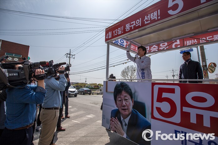 (대구=포커스뉴스) 제20대 국회의원선거 대구 동구을 지역구에서 당선된 무소속 유승민 당선자가 14일 오전 대구 동구 불로시장에 도착해 주민들에게 당선인사 하고 있다.