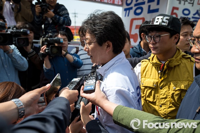 (대구=포커스뉴스) 제20대 국회의원선거 대구 동구을 지역구에서 당선된 무소속 유승민 당선자가 14일 오전 대구 동구 불로시장에 도착해 당선인사에 앞서 취재진과 인터뷰 하고 있다.