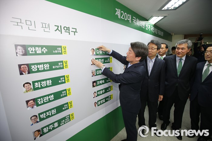 (서울=포커스뉴스) 안철수 국민의당 상임공동대표가 14일 오전 마포구 당사에서 선거 상황판에 당선된 후보들의 이름표를 붙이고 박수를 치고 있다. 왼쪽부터 안 대표, 김성식 관악구갑 국회의원 당선자, 이상돈 비례대표.