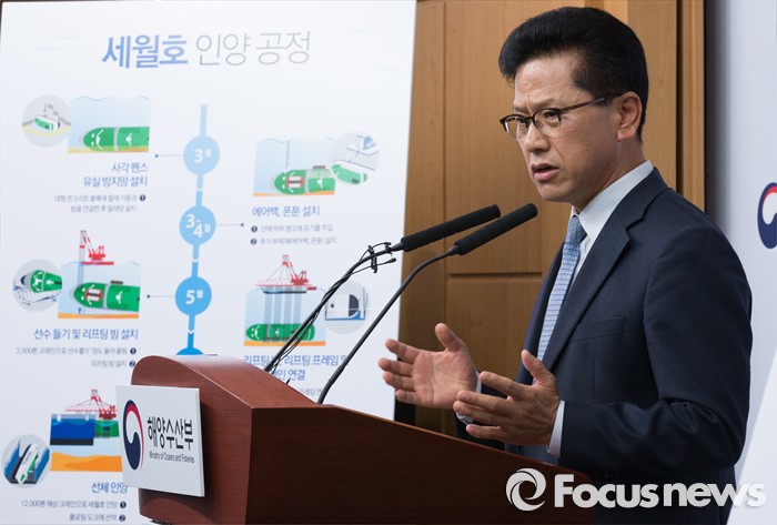 (세종=포커스뉴스) 연영진 세월호 인양추진단장이 14일 오전 세종시 정부세종청사 해양수산부 기자실에서 세월호 인양 작업에 대해 설명하고 있다.