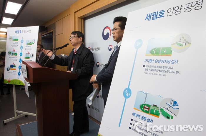 (세종=포커스뉴스) 왕웨이핑 세월호 인양 현장 총감독이 14일 오전 세종시 정부세종청사 해양수산부 기자실에서 세월호 인양 작업에 대해 설명하고 있다.