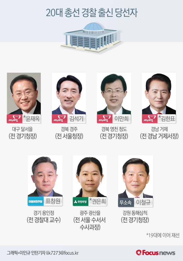 (서울=포커스뉴스) 제20대 국회의원 총선거에서 경찰출신 당선자는 7명으로 집계됐다. 19대 국회(3명)보다 2배 이상 늘어난 역대 최다 기록이다.
