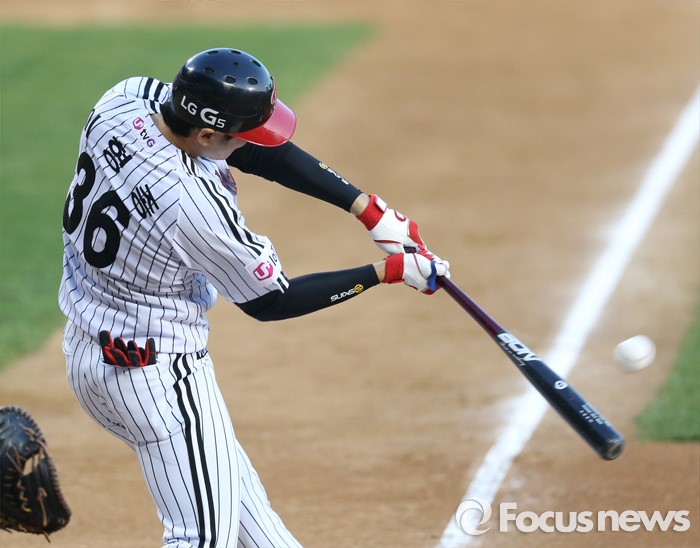 (서울=포커스뉴스) 14일 서울 잠실구장에서 열린 2016 프로야구 롯데-LG 경기 1회말 1사후 LG 이형종이 우중간 2루타를 치고 있다.