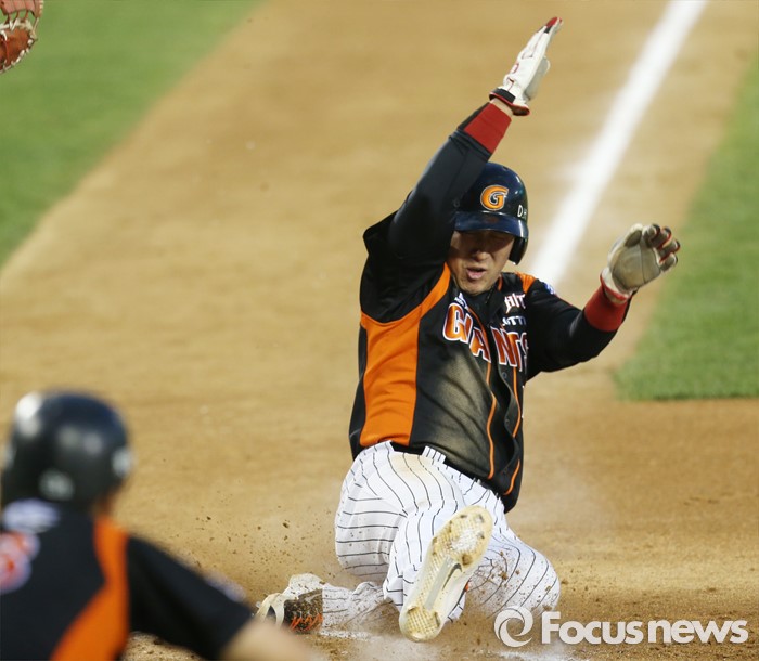 (서울=포커스뉴스) 14일 서울 잠실구장에서 열린 2016 프로야구 롯데-LG 경기에서 3회초 롯데 선두타자로 나와 3루타로 진루한 황재균이 강민호의 중견수 희생플라이때 홈으로 뛰어들어 세이프되고 있다.