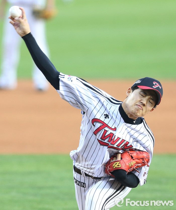 (서울=포커스뉴스) 14일 서울 잠실구장에서 열린 2016 프로야구 롯데-LG 경기에서 1회초 LG 선발투수 임찬규가 투구하고 있다.