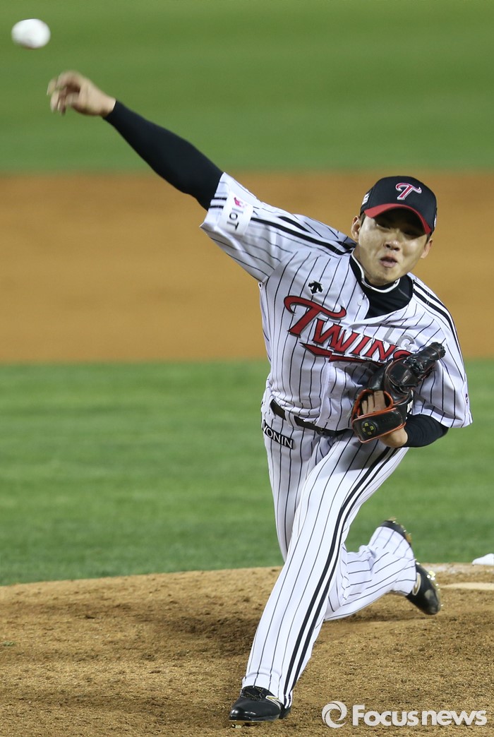 (서울=포커스뉴스) 14일 서울 잠실구장에서 열린 2016 프로야구 롯데-LG 경기 9회초 LG 투수 임정우가 투구하고 있다.