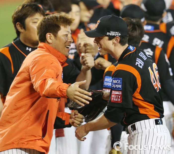 (서울=포커스뉴스) 14일 서울 잠실구장에서 열린 2016 프로야구 롯데-LG 경기에서 롯데 투수 레일리가 10탈삼진 무사사구 완봉승 거두고 주장 강민호의 축하를 받고 있다.