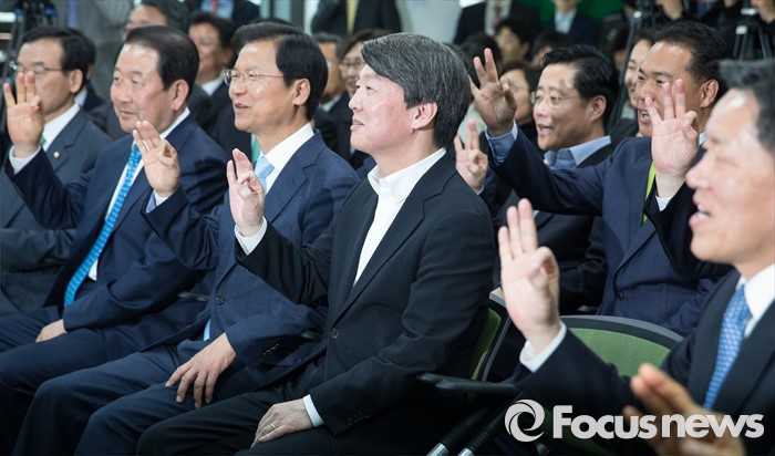 (서울=포커스뉴스) 안철수·천정배 상임공동대표 등 당지도부와 당선자들이 15일 오전 서울 마포구 당사에서 열린 국민의당 당선자 대회 및 선거대책위원회 해단식에서 기호 3번을 그리고 있다. 국민의당은 20대 총선에서 지역구 25석과 비례대표 13석 총 38석의 의석을 석권해 15대 국회 이후 20년 만에 3당 체제를 만들었다.