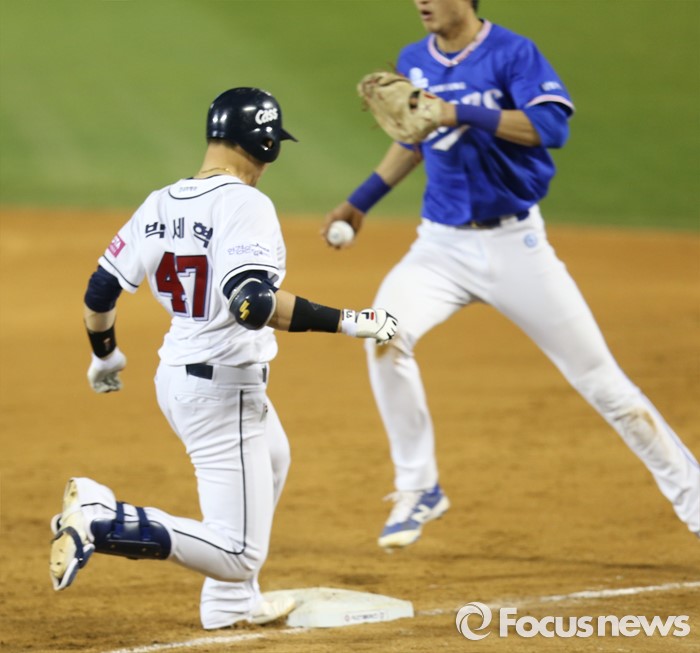 (서울=포커스뉴스) 15일 서울 잠실구장에서 열린 2016 프로야구 삼성-두산 경기 5회말 2사 1,2루에서 두산 박세혁이 1루수쪽 내야안타를 치고 1루에서 세이프되고 있다.