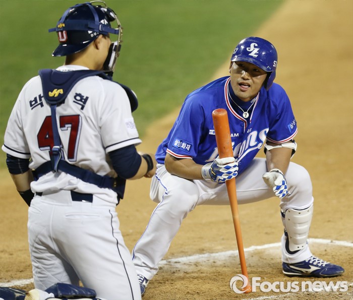 (서울=포커스뉴스) 15일 서울 잠실구장에서 열린 2016 프로야구 삼성-두산 경기 7회초 2사 만루에서 삼성 김상수가 두 번째 스트라이크 판정에 아쉬워하고 있다. 김상수는 두산 정재훈에게 삼진 아웃됐다.