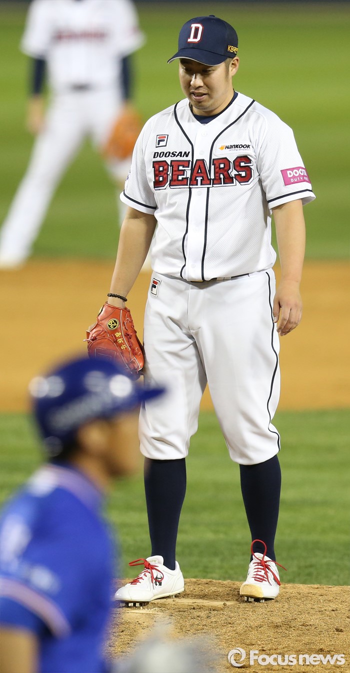 (서울=포커스뉴스) 15일 서울 잠실구장에서 열린 2016 프로야구 삼성-두산 경기 7회초 2사 2루에서 두산 투수 유희관이 삼성 대타 조동찬을 볼넷으로 내보내고 있다.