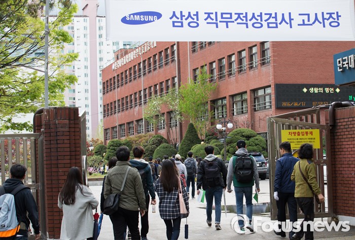 (서울=포커스뉴스) 17일 오전 서울 강남구 단국대학교부속고등학교에서 삼성그룹 공개채용시험 직무적성검사(GSAT)를 치르기 위한 취업준비생들이 고사장으로 향하고 있다.