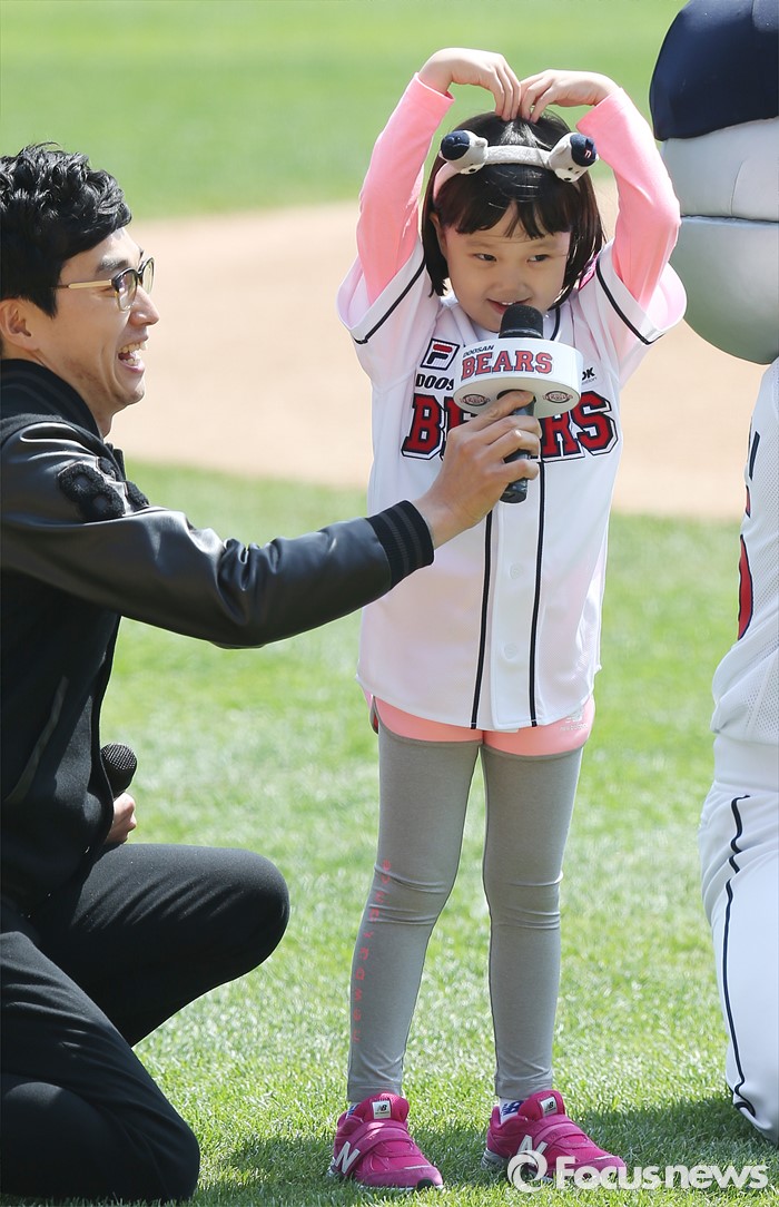(서울=포커스뉴스) 17일 서울 잠실구장에서 열린 2016 프로야구 삼성-두산 경기에 앞서 TV 드라마 '응답하라 1988'에 '진주'로 출연했던 아역 탤런트 김설 어린이가 시구자로 나와 관중에게 사랑의 하트 표시를 날리고 있다.