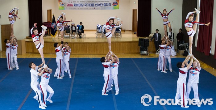 (서울=포커스뉴스) 17일 오후 서울 서대문구 동명여자중학교 체육관에서 열린 '2016 치어리딩 국가대표 선수단 출정식'에 참석한 선수들이 치어리딩 연기를 선보이고 있다.