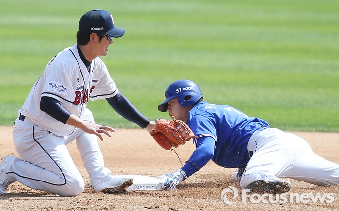 (서울=포커스뉴스) 17일 서울 잠실구장에서 열린 2016 프로야구 삼성-두산 경기 3히초 2사 1루에서 삼성 1루주자 김상수가 배영섭 타석때 2루 도루에 성공하고 있다. 왼쪽은 두산 유격수 김재호.
