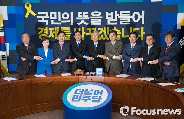 (서울=포커스뉴스) 김종인 더불어민주당 비대위 대표와 비대위원들이 18일 오전 서울 여의도 국회에서 비상대책위원회의에 앞서 취재진을 향해 포즈를 취하고 있다. 왼쪽부터 이개호, 김현미, 김영춘, 진영 비대위원, 김 대표, 이종걸 원내대표, 양승조, 정성호, 이춘석 비대위원.