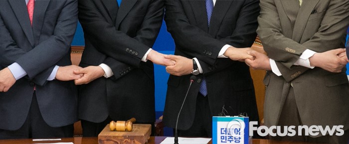 (서울=포커스뉴스) 김종인 더불어민주당 비대위 대표와 비대위원들이 18일 오전 서울 여의도 국회에서 비상대책위원회의에 앞서 취재진을 향해 포즈를 취하고 있다.