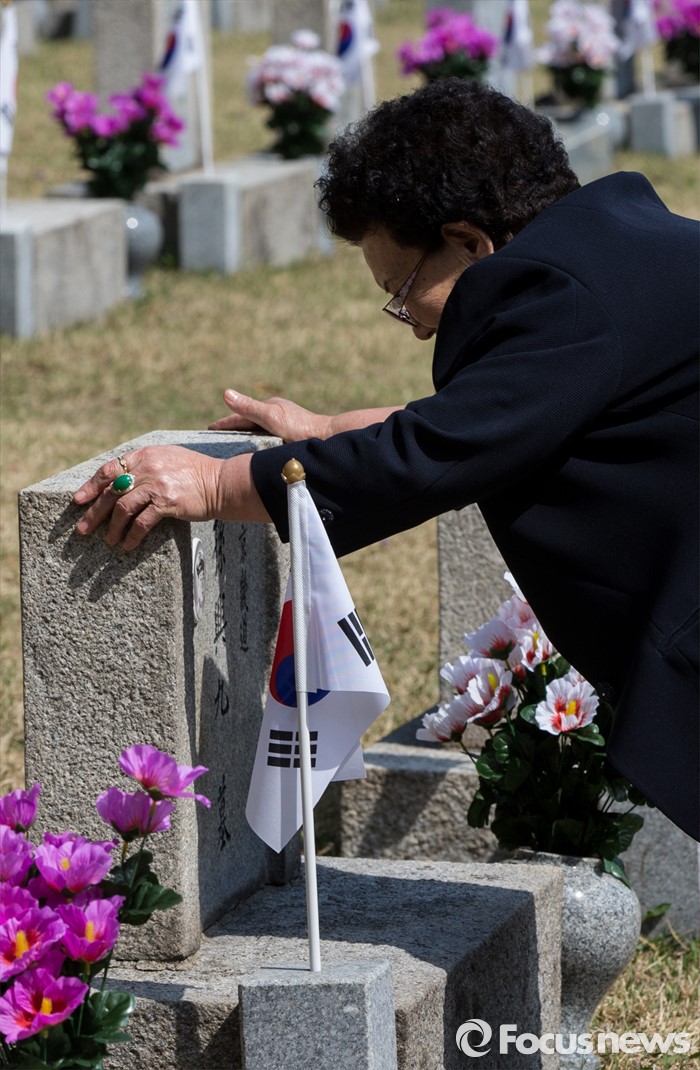 (서울=포커스뉴스) 4·19 혁명 56주기를 하루 앞둔 18일 오전 서울 강북구 국립4.19 민주묘지를 찾은 한 유가족이 남편의 묘비를 어루만지고 있다.