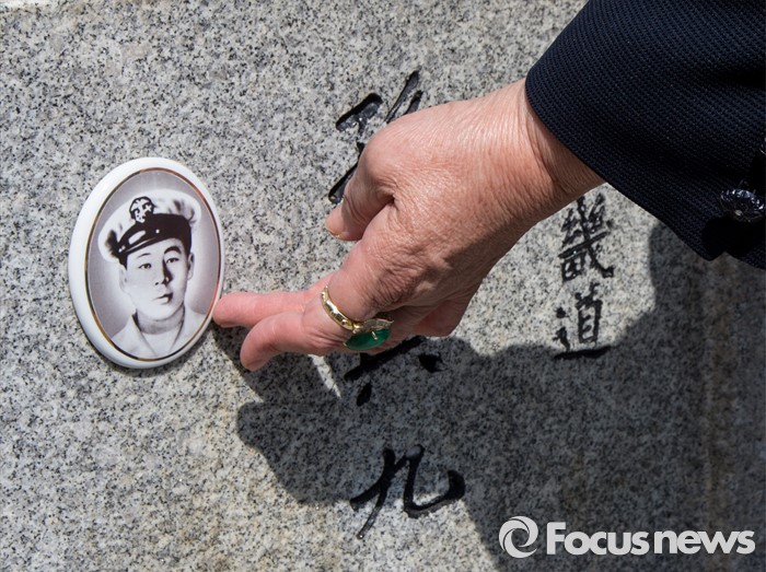 (서울=포커스뉴스) 4·19 혁명 56주기를 하루 앞둔 18일 오전 서울 강북구 국립4.19 민주묘지를 찾은 한 유가족이 남편의 묘비를 어루만지고 있다.