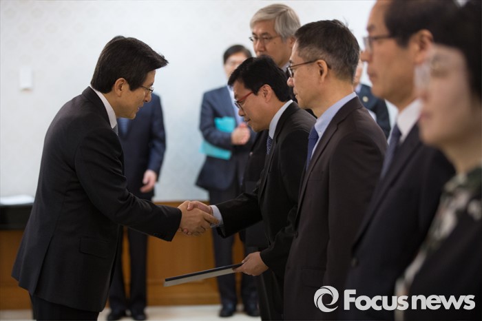 (서울=포커스뉴스) 황교안 국무총리가 18일 오전 서울 종로구 정부서울청사에서 민간위원에게 도시재생특별위 위촉장을 수여하고 있다.
