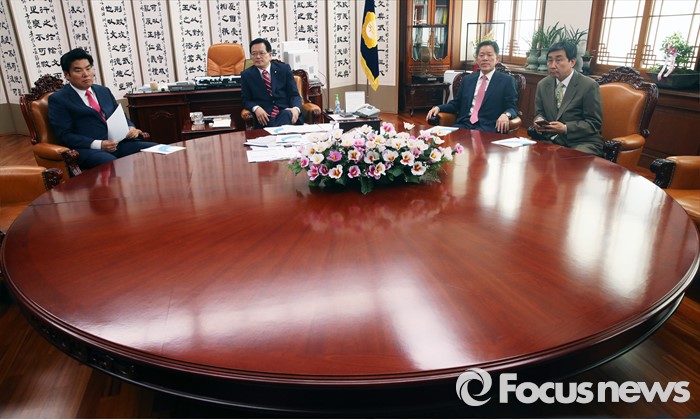 (서울=포커스뉴스) 정의화 국회의장과 여야 3당 원내대표가 18일 오전 서울 여의도 국회 의장실에서 열린 회동에서 굳은 얼굴로 대화를 나누고 있다. 여야 지도부는 국회의장 주선으로 마련된 이 자리에서 한 달여 남은 19대 국회 의사일정과 계류 법안 처리 방안 등을 논의한다. 왼쪽부터 새누리당 원유철 원내대표, 정의화 국회의장, 더불어민주당 이종걸 원내대표, 국민의당 주승용 원내대표.