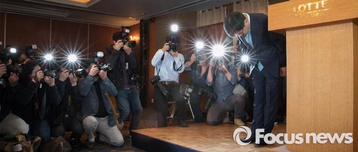 (서울=포커스뉴스) 김종인 롯데마트 대표를 비롯한 경영진들이 18일 오전 서울 중구 롯데호텔앤리조크 서울에서 열린 가습기 살균제 사망사건 관련 기자회견에서 고개 숙여 사과를 하고 있다.