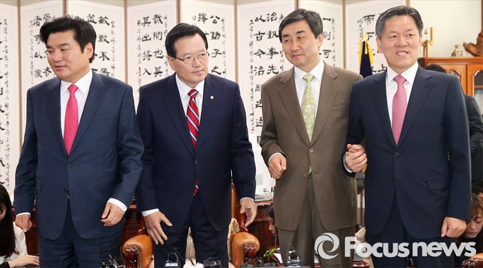 (서울=포커스뉴스) 정의화(왼쪽 두번째) 국회의장과 여야 3당 원내대표가 18일 오전 서울 여의도 국회 의장실에서 열린 첫 회동에서 기념사진을 찍은 뒤, 자리로 향하고 있다. 왼쪽부터 새누리당 원유철 원내대표, 정 의장, 더불어민주당 이종걸 원내대표, 국민의당 주승용 원내대표.