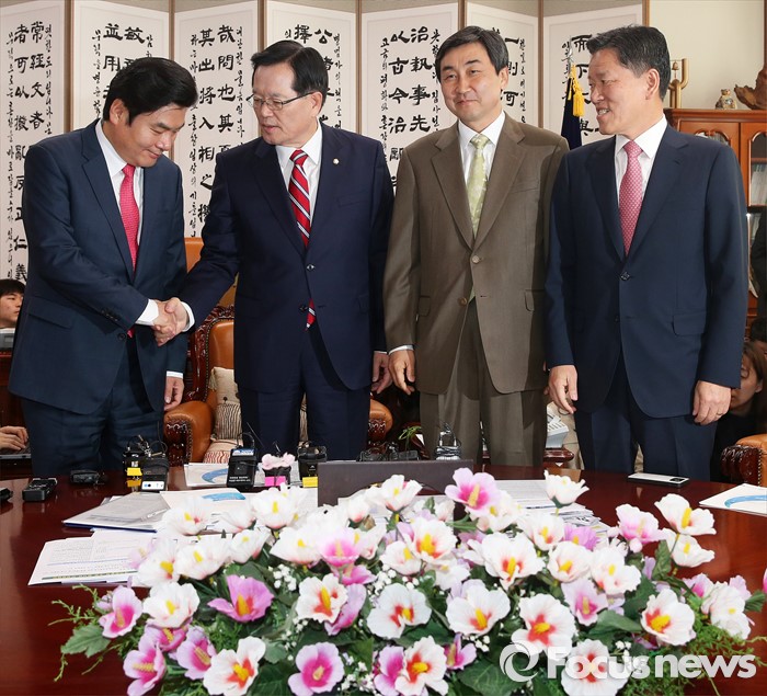 (서울=포커스뉴스) 18일 오전 서울 여의도 국회 의장실에서 열린 3당 원내대표 회동에서 정의화 국회의장과 원유철 새누리당 원내대표가 악수하고 있다. 왼쪽부터 새누리당 원유철 원내대표, 정 의장, 더불어민주당 이종걸 원내대표, 국민의당 주승용 원내대표.
