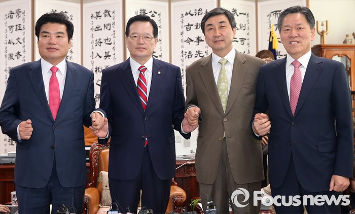 (서울=포커스뉴스) 정의화(왼쪽 두번째) 국회의장과 여야 3당 원내대표가 18일 오전 서울 여의도 국회 의장실에서 열린 첫 회동에서 정 의장의 제안으로 손을 맞잡고 있다. 왼쪽부터 새누리당 원유철 원내대표, 정 의장, 더불어민주당 이종걸 원내대표, 국민의당 주승용 원내대표.