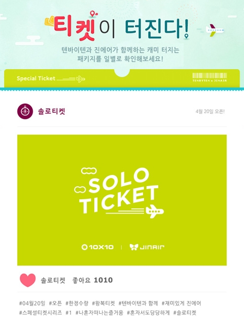 진에어는 고객을 세분화해 고객 특성에 맞는 재미난 콘셉트의 '스페셜티켓' 시리즈를 텐바이텐에서 판매하기로 제휴 맺었다. 그 첫 번째로 '솔로티켓'을 판매한다.