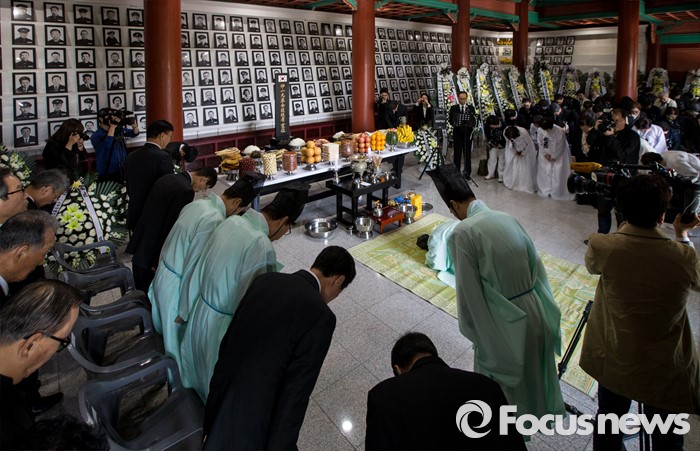 (서울=포커스뉴스) 4·19 혁명 56주기를 하루 앞둔 18일 오전 서울 강북구 국립4.19 민주묘지 유영봉안소에서 열린 4.19 혁명 희생영령 추모제를 찾은 유가족 및 관계자들이 예를 올리고 있다.