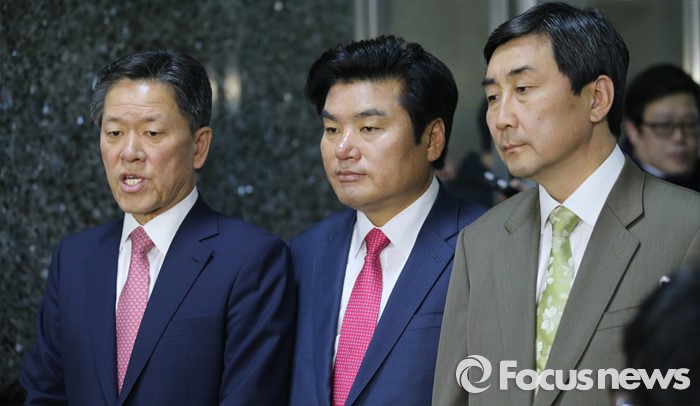 (서울=포커스뉴스) 정의화 국회의장 주재로 진행된 3당 원내대표 회동을 마친 원유철(가운데) 새누리당 원내대표, 이종걸(오른쪽) 더불어민주당 원내대표, 주승용 국민의당 원내대표가 18일 오전 서울 여의도 국회 의장집무실 앞에서 취재진 질문에 답하고 있다.