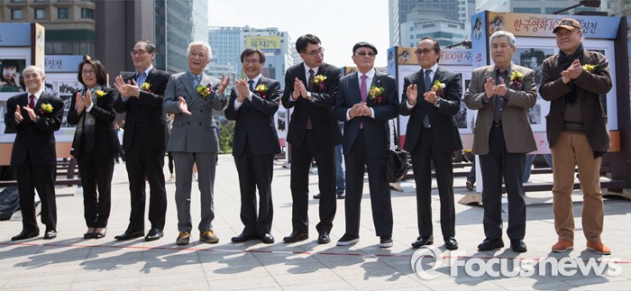 (서울=포커스뉴스) 18일 오후 서울 시청 앞 광장에서 열린 '한국영화 100년 사진전' 개막식에서 배우 신성일(왼쪽 네번째부터), 정관주 문화체육관광부 차관, 류재림 한국영상자료원장이 대화하며 박수치고 있다. 오른쪽 두번째는 임권택 감독.