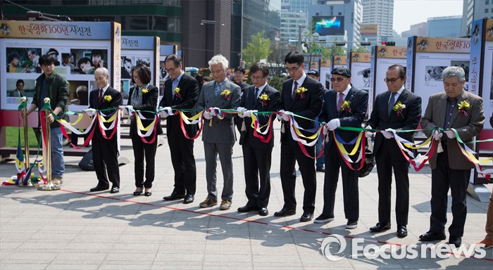 (서울=포커스뉴스) 18일 오후 서울 시청 앞 광장에서 열린 '한국영화 100년 사진전' 개막식에서 배우 신성일, 정관주 문화체육관광부 차관, 류재림 한국영상자료원장을 비롯한 내,외빈들이 테이프 컷팅을 하고 있다. 왼쪽 다섯번째부터 배우 신성일, 정관주 문화체육관광부 차관, 류재림 한국영상자료원장. 오른쪽 첫번째 임권택 감독.