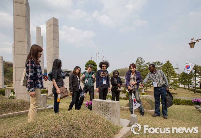(서울=포커스뉴스) 4·19 혁명 56주기를 하루 앞둔 18일 오후 서울 강북구 국립4.19 민주묘지에서 한신대학교 신학과 외국인 학생들이 희생자 묘소를 참배하고 있다.